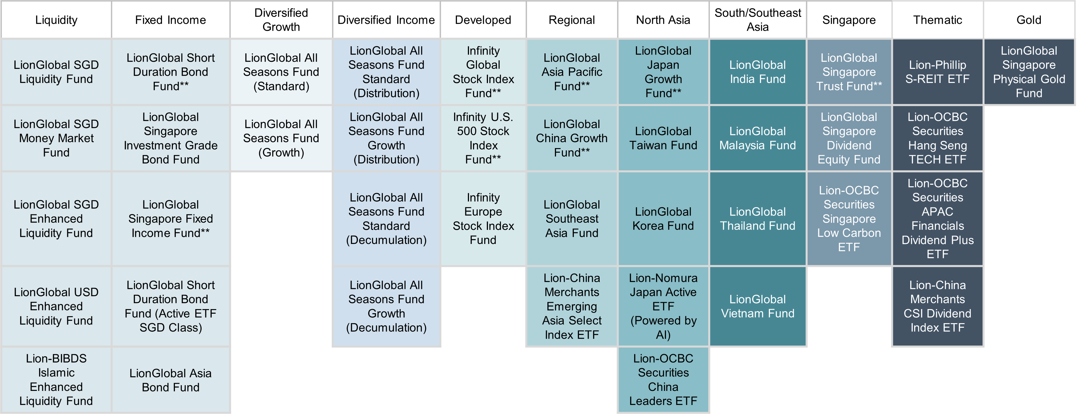 **CPFIS Funds: LionGlobal Short Duration Bond Fund Class A SGD (Dist), LionGlobal Singapore Fixed Income Investment Class A SGD, Infinity Global Stock Index Fund SGD, Infinity Global Stock Index Fund Class C SGD, Infinity U.S. 500 Stock Index Fund SGD, LionGlobal Asia Pacific Fund SGD, LionGlobal China Growth Fund SGD, LionGlobal Japan Growth Fund SGD, LionGlobal Japan Growth Fund SGD-Hedged and LionGlobal Singapore Trust Fund SGD.