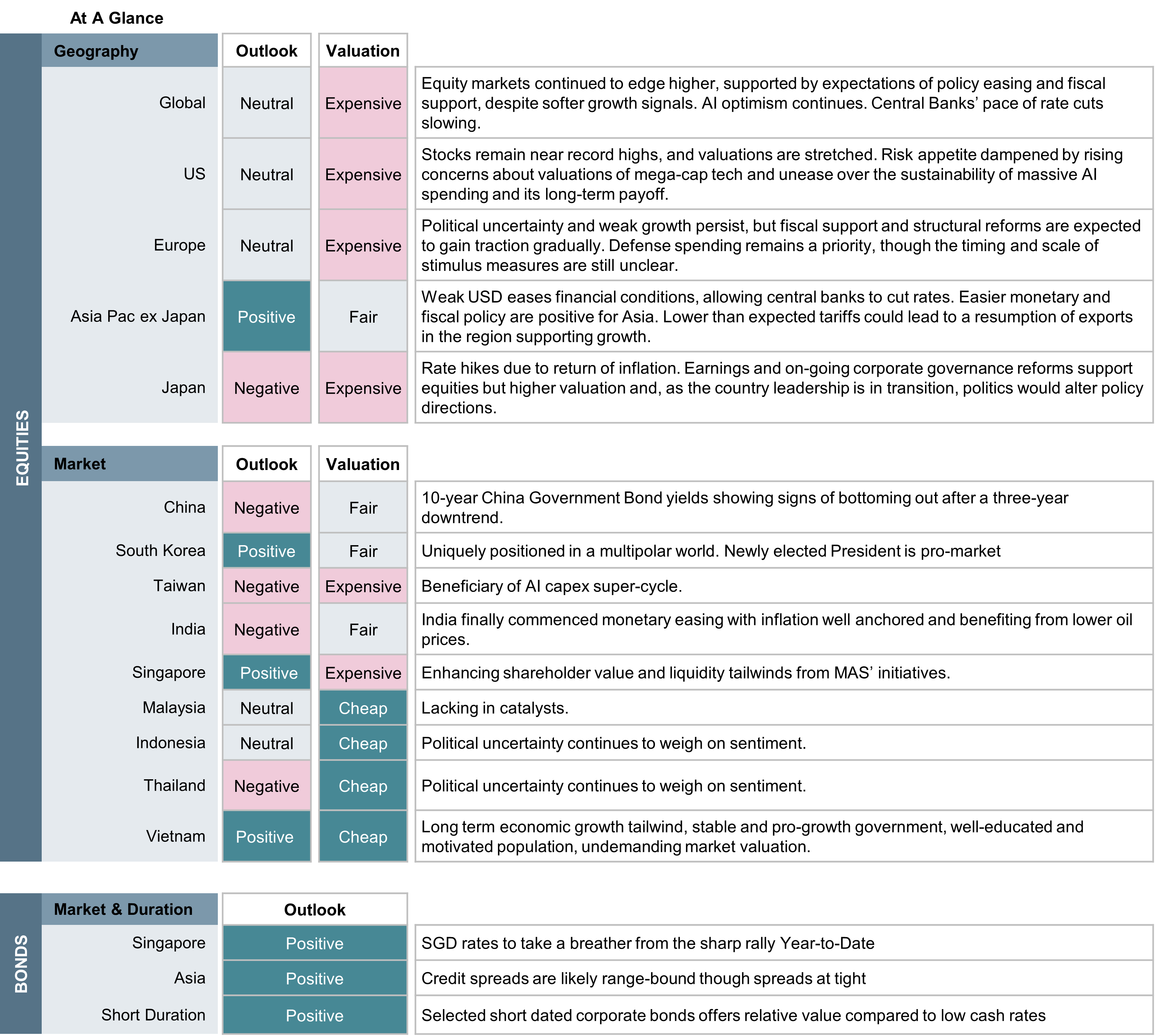 | Asia | Asia’s outlook is mixed. China’s growth is likely to slow as exports weaken and the property market remains soft, though tech-driven industries provide some support. Domestic demand should hold up but not accelerate. Other Asian economies, especially Korea and Taiwan should benefit from global tech spending but may feel the drag from China’s slower pace. | Inflation in Asia is generally lower and more stable. China’s softer growth and weak property market should keep price pressures contained, though food and energy costs remain watch points. Singapore raised 2026 inflation target from 0.5% -1.5% to 1% -2% due to upside risk to economic growth. | Across the broader Asia region, inflation remains well-contained thanks to steady supply chains and moderate demand, allowing central banks to keep policy balanced, while China still has room to cut borrowing costs or lower bank reserve requirements if needed to support its 4.5 - 5% growth target. MAS has kept its SGD policy unchanged in the latest meeting. |